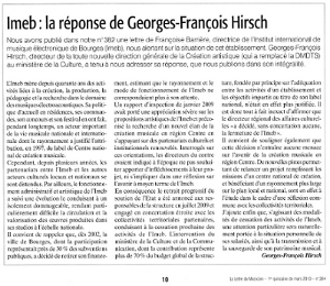 Georges-François Hirsch dément la thèse d’une décision arbitraire et sans concertation, visant à permettre au Ministère de la Culture de « faire des économies ». Il évoque un rapport datant de janvier 2009, portant une « appréciation sévère sur les propositions artistiques de l’IMEB » et préconisant « la recherche d’un nouvel élan de la création musicale en Région Centre s’appuyant sur des partenaires culturels et institutionnels renouvelés ». La direction de l’IMEB aurait alors refusé toute réflexion et toute remise en cause de son fonctionnement, interprétant les recommandations du ministère dans Le Berry Républicain comme une forme de « chantage ».