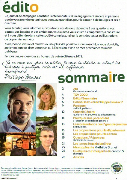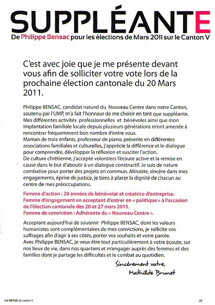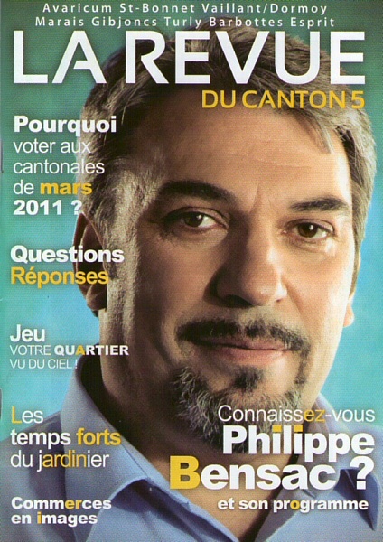 Allez, un petit jeu : combien de fois Philippe Bensac (Nouveau Centre), Sarkozyste de toujours, apparait-il sur sa plaquette [1] ? On n’est pas bien sûr que Philippe Bensac soit centriste, mais une chose est sûre, il est centré sur lui-même. Que je m’aime semble dire la plaquette... d’où son aspect plus que comique. Qui a dit que les politiques étaient des clowns ?