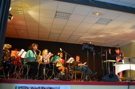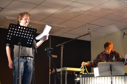 Effectivement, pendant la représentation, un silence pesant fait réagir Ian Monk : « Ca vous emmerde ? », lance-t-il au public. Quelques personnes n’iront pas au bout de la lecture, mais la plupart s’accroche. Imperturbable, Georges Andrès [2] propose des improvisations qui étonnent elles aussi. Des lames de métallophone sont jetées à terre, des balles de ping-pong rebondissent sur les toms de sa batterie ... Apparemment, les amateurs de la Lyre de Baugy, jusqu’alors peu habitués à ce répertoire de musique concrète, ont réussi à dépasser leurs doutes après seulement quatre répétitions.