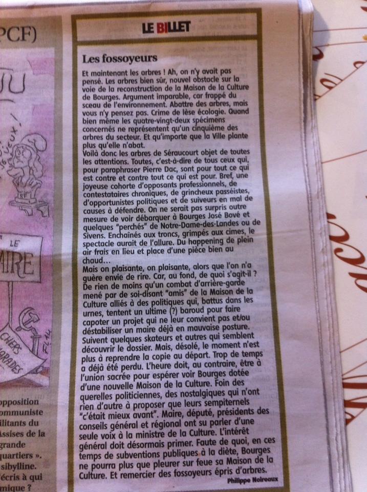 Et il n’y va pas avec le dos de la cuillère. Le rédacteur en chef du Berry Républicain parle des manifestants comme « une joyeuse cohorte d’opposants professionnels, de contestataires chroniques, de grincheux passéistes, d’opportunistes politiques et de suiveurs en mal de causes à défendre ». Eh bé ! Il est bien rare de trouver de telles prises de position dans le BR. Bien sûr, Philippe Noireaux ne cite personne. Quoique, un peu plus loin, il parle d’un « combat-d’arrière garde mené par des soi-disant "amis" de la Maison de la Culture alliés à des politiques qui, battus dans les urnes tentent un ultime (?) baroud pour faire capoter le projet qui ne leur convient pas et/ou déstabiliser un maire déjà en mauvaise posture ». Là, quelques-uns ne peuvent que se sentir visés. Globalement, M. Noireaux fait un appel à l’union sacrée pour la Maison de la Culture. Au diable les arbres, le bûcheron en chef a parlé. On fera juste remarquer à M. Noireaux que son journal a régulièrement fait part de protestations de citoyens lorsqu’il s’agit d’abattre des arbres à Bourges. Ce n’est pas nouveau. Et ça fait du papier...bref, ça tue les arbres [1]. La boucle est bouclée.
